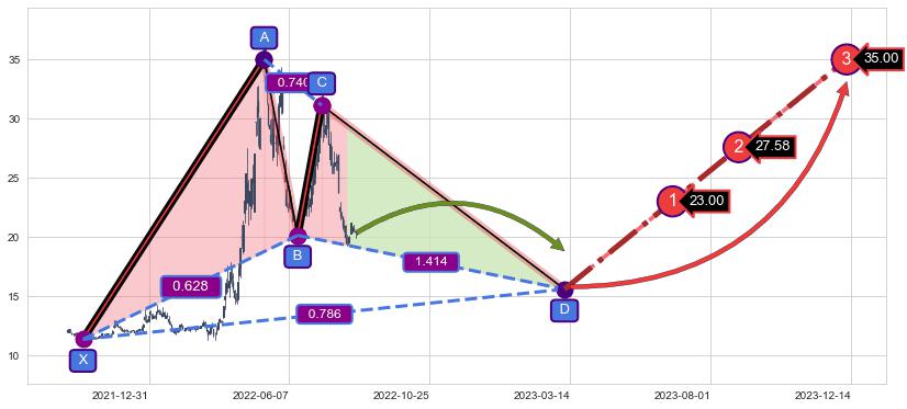 ➣ AI预测: 假定反转启动后, 第❸目标位置(2023-12-14, 35.00)