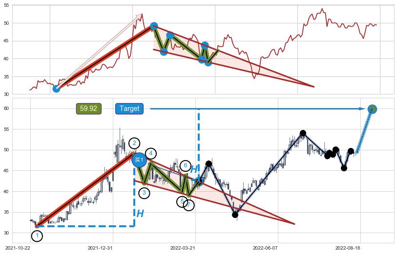 ➢ 【买1】: 激进型 买点 →(2022-03-23: 42.30 )形成突破降🚩楔型【整理】形态