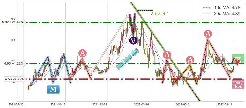 ♘ 阻力价格位4.93,可信任强度83.46%,距离最后交易2022-08-12形成的收盘价格4.87相差 +1.22%
