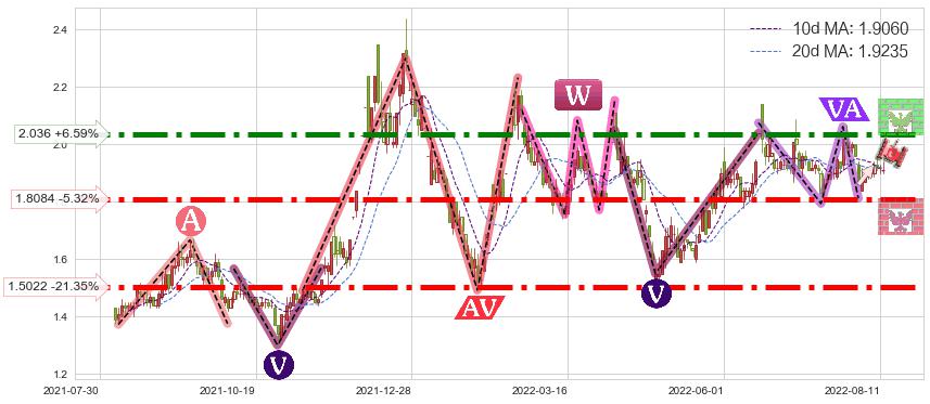 ♘ 阻力价格位2.036,可信任强度93.32%,距离最后交易2022-08-12形成的收盘价格1.9100相差 +6.59%