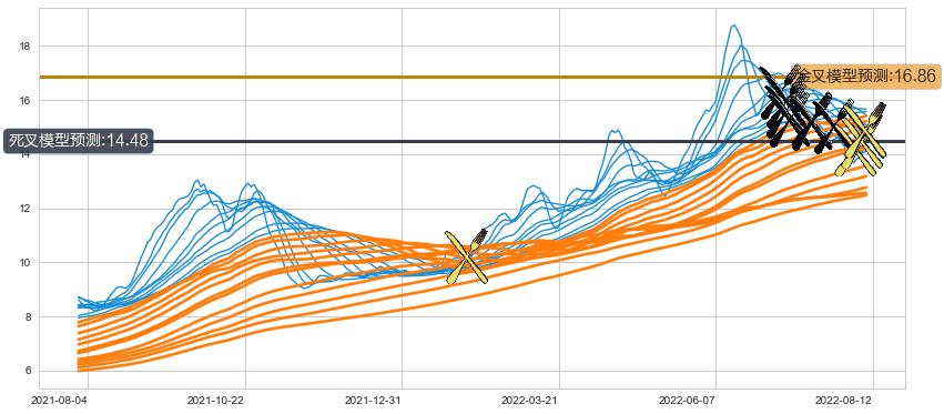 ➣ 55小时均线于(2022-07-08: 15.22)形成【死叉】基于【死叉历史模型】预测死叉后最低波谷价格: 14.52, 死叉后最低价格13.39,已经下跌超出预测最低波谷价格, 预期反弹