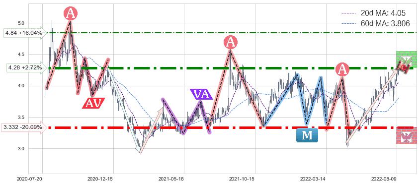 ♘ 阻力价格位4.84,可信任强度53.53%,距离最后交易2022-08-12形成的收盘价格4.17相差 +16.04%