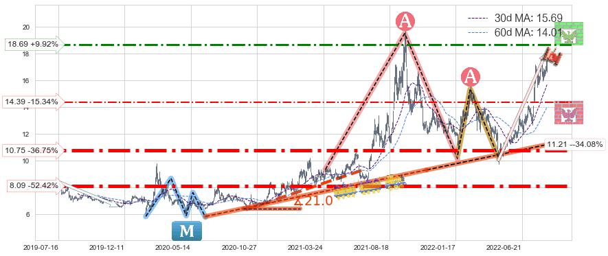 ♘ 阻力价格位18.69,可信任强度55.62%,距离最后交易2022-08-12形成的收盘价格17.00相差 +9.92%