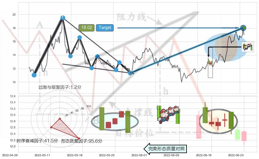 ➢ 🕰 价格走势在2022-06-16至2022-06-16期间形成看涨(低位)倒锤头线,残存影响值:0.98