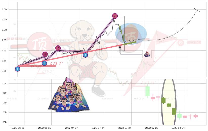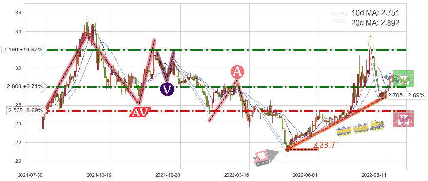 ♘ 阻力价格位3.196,可信任强度71.49%,距离最后交易2022-08-12形成的收盘价格2.780相差 +14.97%