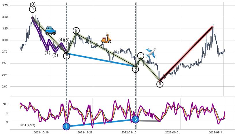 ➣ 第一, 三驱动浪端点:【KDJ】走势出现【常规背离 & 反转信号】背离程度75.49%,背离夹角角度50.3˚,背离程度较小