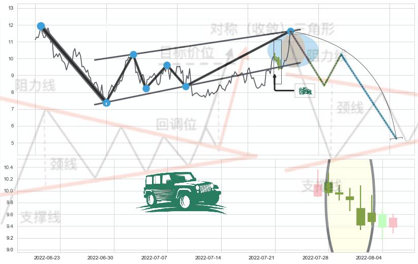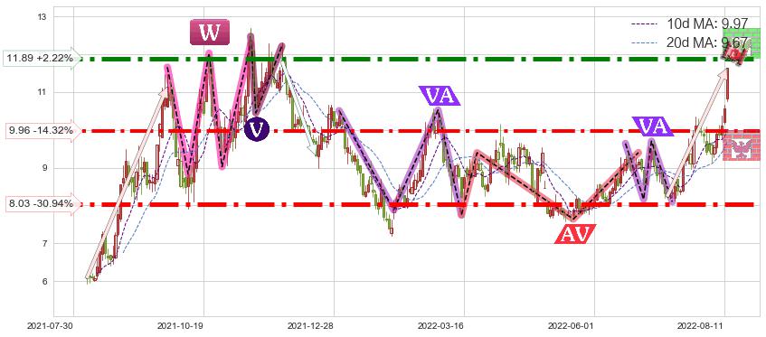 ♘ 支撑价格位9.96,可信任强度76.18%,距离最后交易2022-08-12形成的收盘价格11.63相差 -14.32%