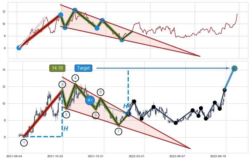 ➣ 降楔型:猜想预期上涨目标target即将达成,随后猜想强阻力来临,预期回调下跌(均值回复)