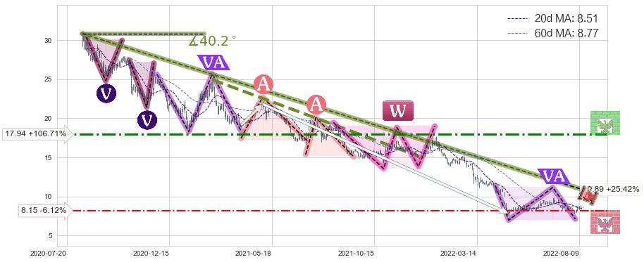♘ 阻力价格位17.94,可信任强度67.79%,距离最后交易2022-08-12形成的收盘价格8.68相差 +106.71%