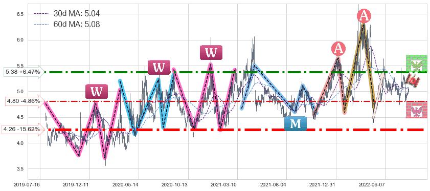 ♘ 阻力价格位5.38,可信任强度83.45%,距离最后交易2022-08-12形成的收盘价格5.05相差 +6.47%