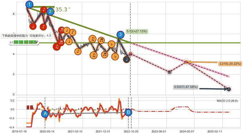 ♘ 在最后的下跌阶段2019-07-19至2022-08-11,存在 持续未破位的阻力位 ,阻力价格5.12,可信任强度88.57%,其距离最后价格4.03相差 +27.13%