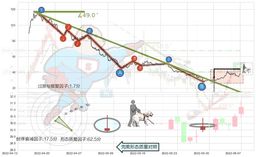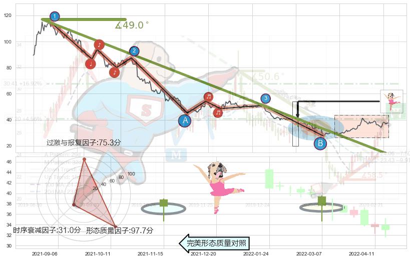 从2020-12-25至2022-07-01,共包含366个交易日,阶段股价下跌-97.37%,阶段股价变动位移路程比: 1 : 6,下跌趋势角度: 49.0