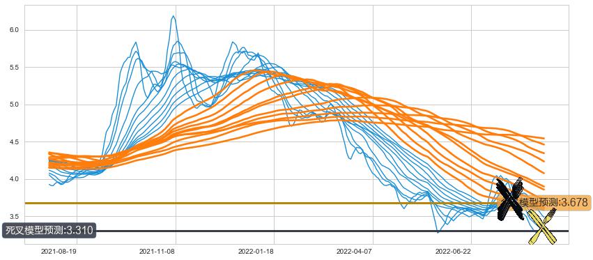 ➣ 60小时均线于(2022-07-19: 3.678)形成【死叉】基于【死叉历史模型】预测死叉后最低波谷价格: 3.298, 死叉后最低价格3.210,已经下跌超出预测最低波谷价格, 预期反弹
