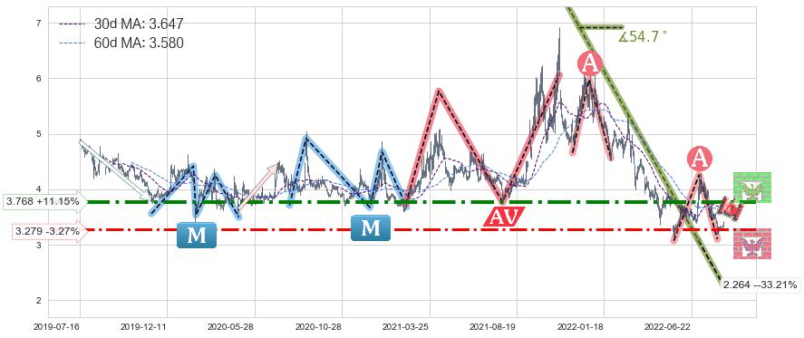 ♘ 阻力价格位3.768,可信任强度81.35%,距离最后交易2022-08-12形成的收盘价格3.390相差 +11.15%