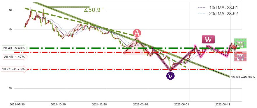 ♘ 阻力价格位30.43,可信任强度89.13%,距离最后交易2022-08-12形成的收盘价格28.87相差 +5.40%