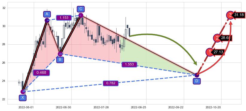 ➢ 距离预测D点位置尚有下跌空间,短线依然【看跌】, 耐心等待看涨【赛福】形态反转启动
