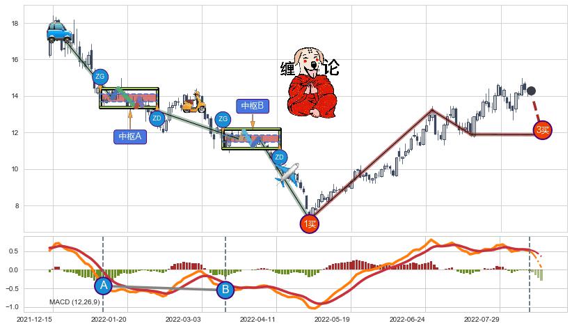 ➣ 【中枢B】:2022-03-22-2022-03-30,中枢由4笔构成,共7交易日, ZG=11.69, ZD=11.62