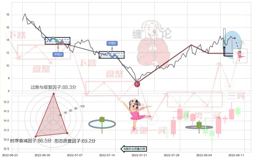 ➢ 【中枢A】:2022-01-13-2022-01-27,中枢由5笔构成,共11交易日, ZG=13.89, ZD=13.89