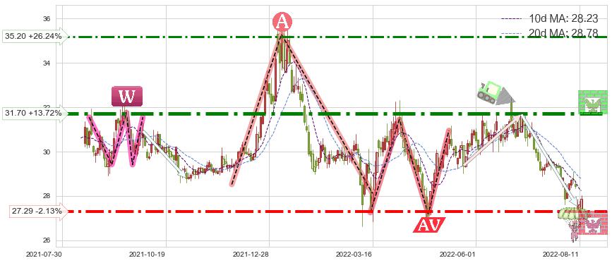 ♘ 支撑价格位27.29,可信任强度73.49%,距离最后交易2022-08-12形成的收盘价格27.88相差 -2.13%