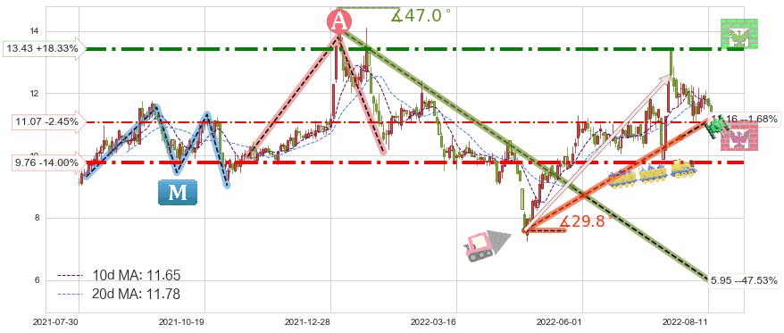 ♘ 支撑价格位11.07,可信任强度45.66%,距离最后交易2022-08-12形成的收盘价格11.35相差 -2.45%