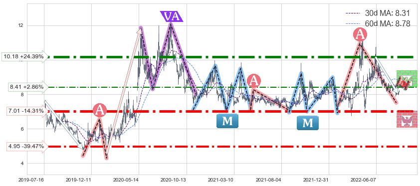 ♘ 支撑价格位7.01,可信任强度98.51%,距离最后交易2022-08-12形成的收盘价格8.18相差 -14.31%