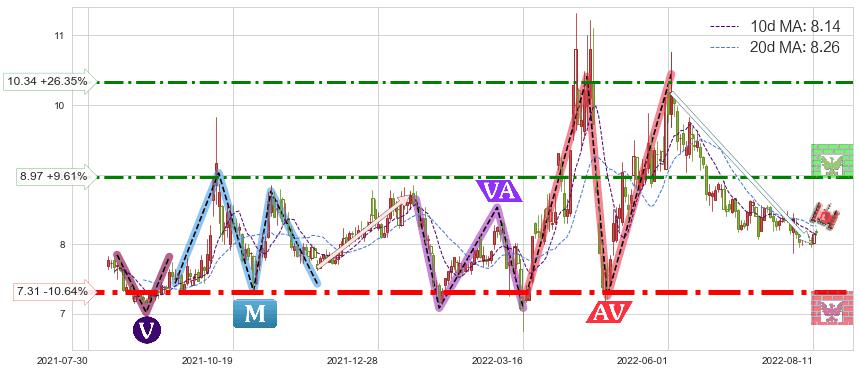 ♘ 支撑价格位7.31,可信任强度96.72%,距离最后交易2022-08-12形成的收盘价格8.18相差 -10.64%