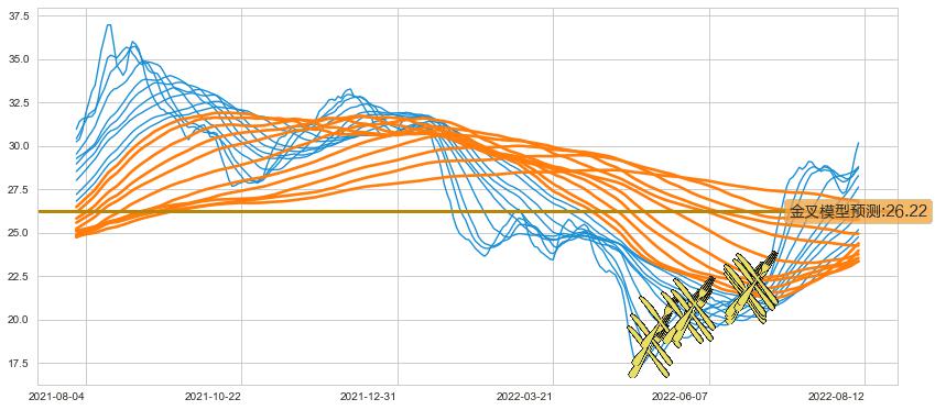 ➣ 80小时均线于(2022-06-27: 22.03)形成【金叉】基于【金叉历史模型】预测金叉后最高波峰价格: 27.69, 金叉后最高价格31.75,已经上涨超出预测最高波峰价格, 预期回调