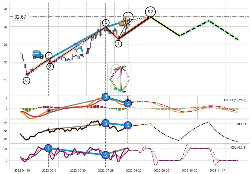 ➣ 5.1: 预测当前第5浪位置(2022-08-11, 31.75),仍然有上升空间