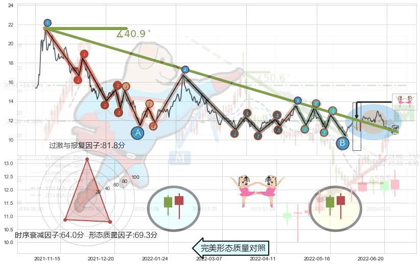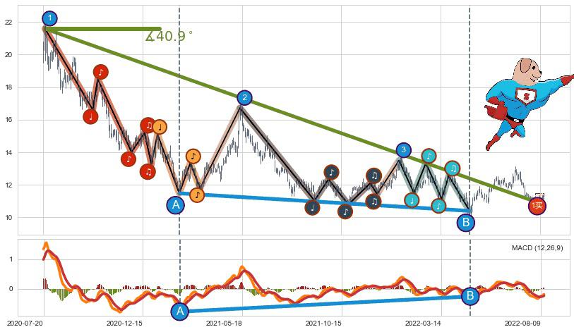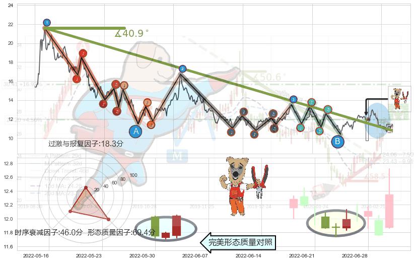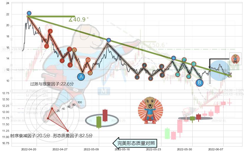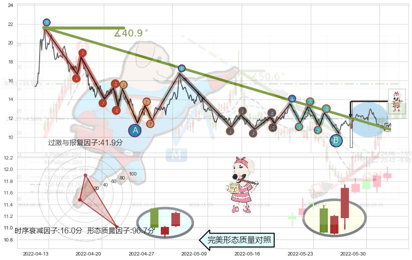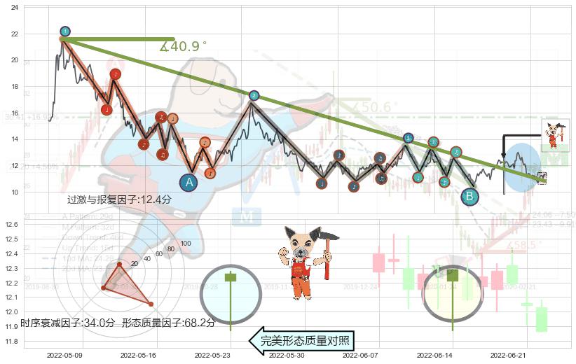 ➢ 2020-07-22-2022-05-26下跌趋势存在反转上涨[机会],虽然原下跌趋势的阻力位(10.80)已被突破,但其阻力效果尚存,原下跌趋势角度: 40.9˚