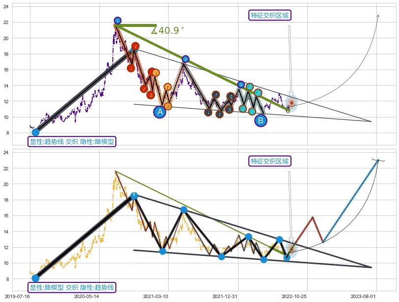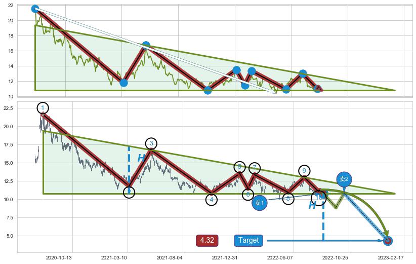 ➢ 下降三角整理:猜想临近关键支撑位突破点 → 临近拐点下跌 → 风险信号 → 大趋势均值回复