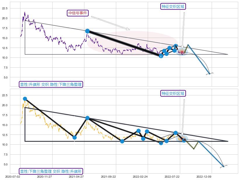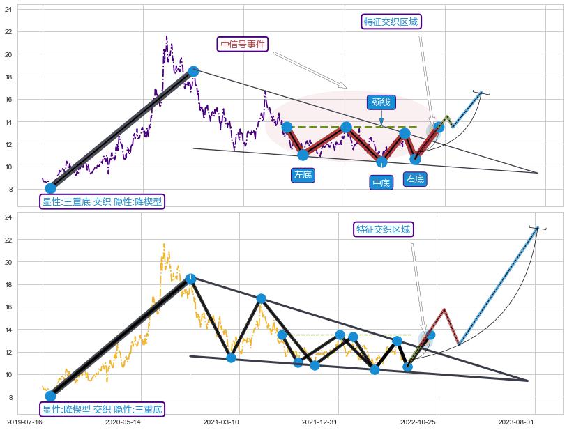 ➢ 趋势线与降楔型信号事件周期长度级别相同,同周期信号事件