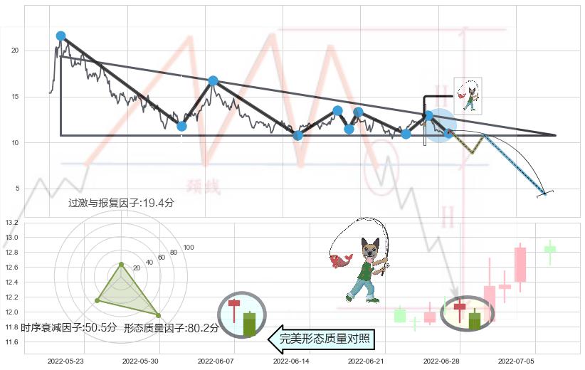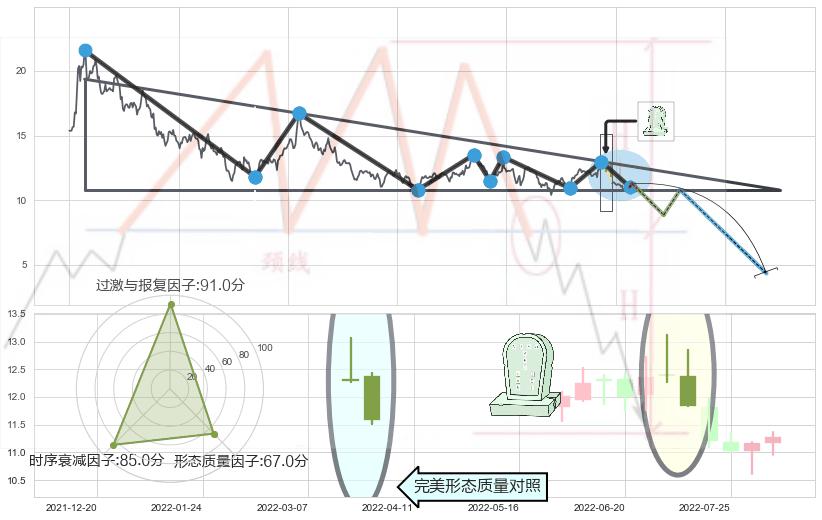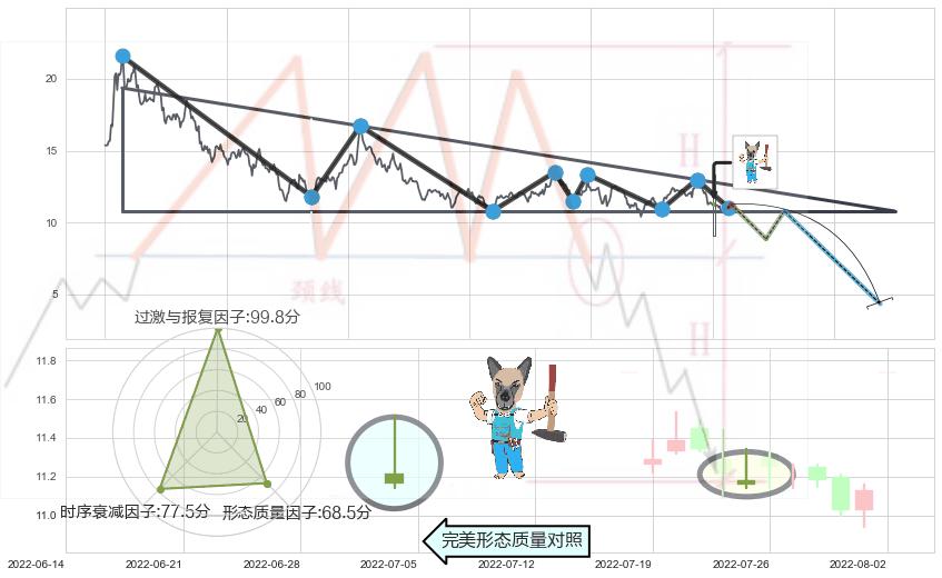 ➢ AI智能: 预测【多空防线逐步靠近→双方接火→空方占优】下降三角形中继整理向下突破,预测将在2022-08-22突破颈线, 演变成下降通道