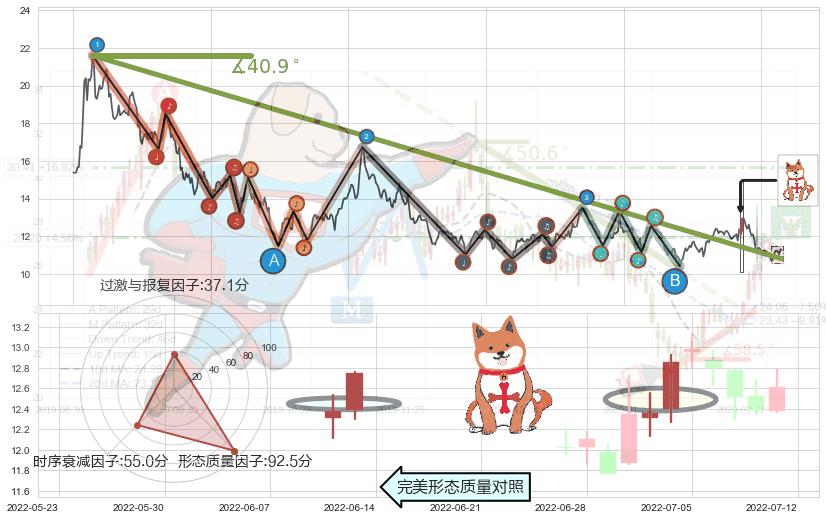 从2020-07-22至2022-05-26,共包含447个交易日,阶段股价下跌-50.48%,阶段股价变动位移路程比: 1 : 14,下跌趋势角度: 40.9