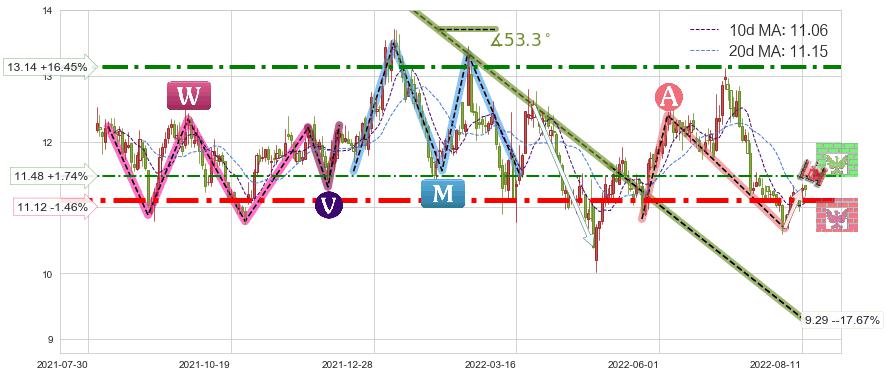 ♘ 阻力价格位11.48,可信任强度47.31%,距离最后交易2022-08-12形成的收盘价格11.28相差 +1.74%