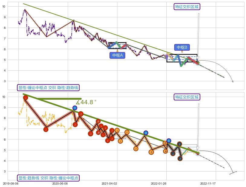 ➣ 缠论中枢点:猜想破位中枢B后持续下拉 → 下跌 → 破位中枢B支撑 → 持续趋势跟踪