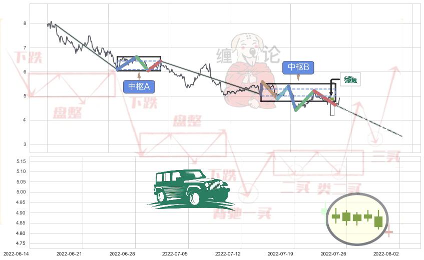 ➣ 【中枢B】:2022-01-27-2022-08-03,中枢由7笔构成,共124交易日, ZG=5.21, ZD=5.07