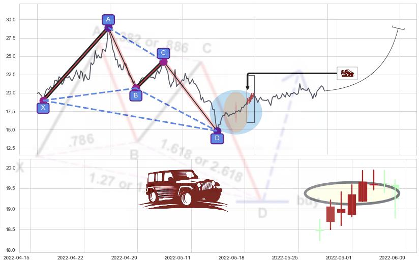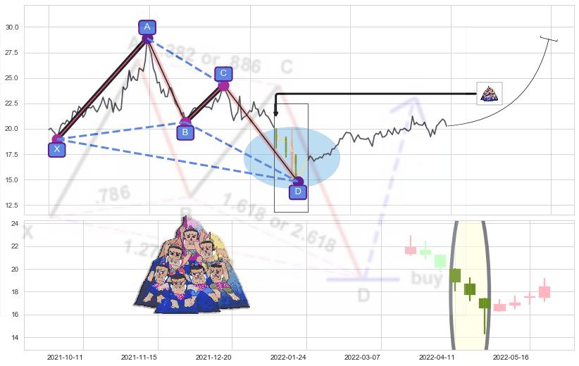 ➢ 谐波蝴蝶:c下跌到达d:猜想拉升 → 上涨 →【拐点】强支撑临近 → 大趋势均值回复