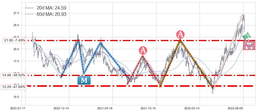 ♘ 支撑价格位21.80,可信任强度77.62%,距离最后交易2022-08-12形成的收盘价格23.56相差 -7.49%