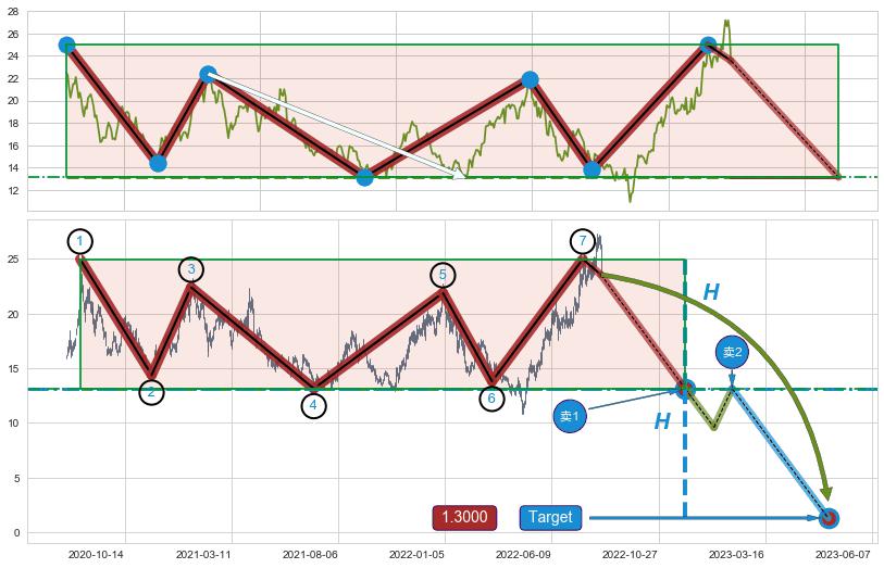 ➢ 下跌矩形整理:猜想临近关键支撑位突破点 → 临近拐点下跌 → 风险信号 → 大趋势均值回复