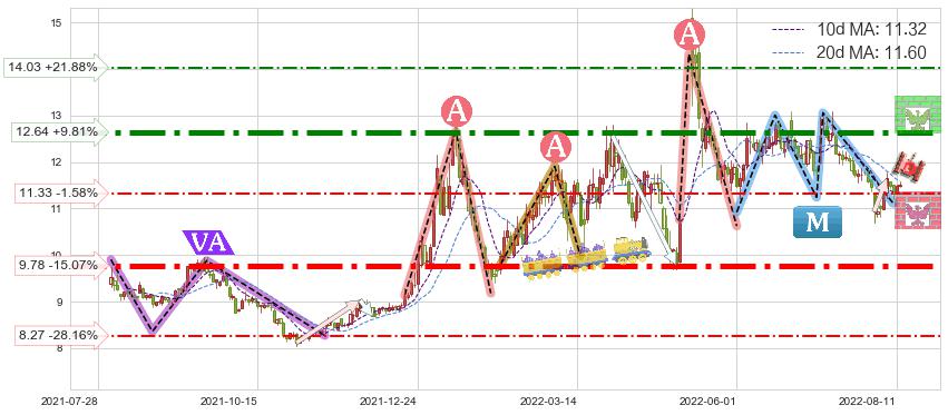 ♘ 支撑价格位11.33,可信任强度54.19%,距离最后交易2022-08-12形成的收盘价格11.51相差 -1.58%