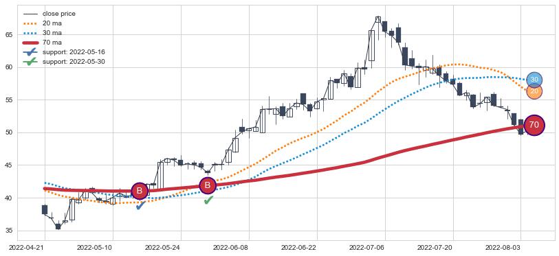 ➣ 90小时均线于(2022-05-16: 41.13)形成【金叉】基于【金叉历史模型】预测金叉后最高波峰价格: 53.70, 金叉后最高价格67.75,已经上涨超出预测最高波峰价格, 预期回调
