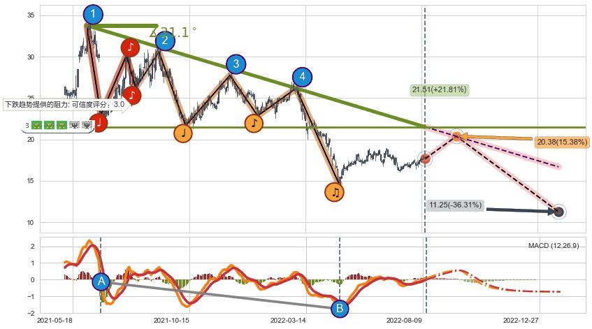 ♘ 阻力价格位21.98,可信任强度94.95%,距离最后交易2022-08-12形成的收盘价格17.66相差 +24.47%