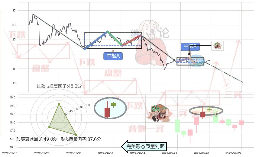 ➢ 看跌(高位倒锤头)流星线 🔜 缠论中枢点破位中枢B支撑下拉 综合量化分数:47.50 【中性】