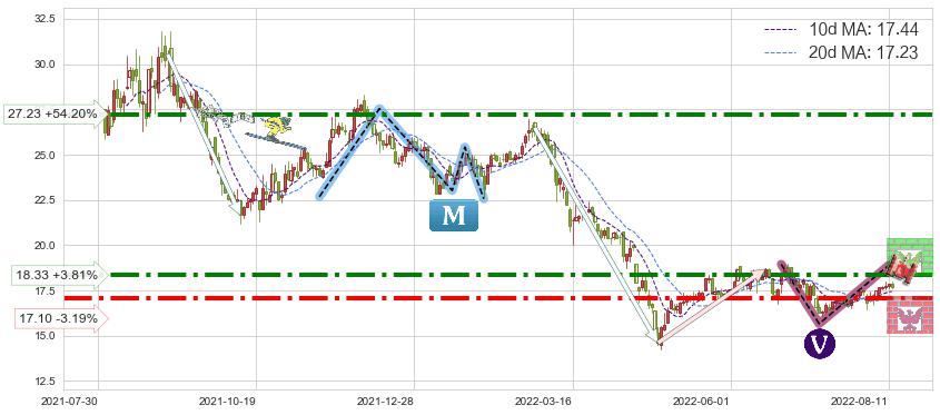♘ 阻力价格位18.33,可信任强度83.59%,距离最后交易2022-08-12形成的收盘价格17.66相差 +3.81%