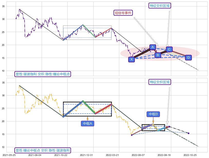 ➣ 缠论中枢点:猜想破位中枢B后持续下拉 → 下跌 → 破位中枢B支撑 → 持续趋势跟踪