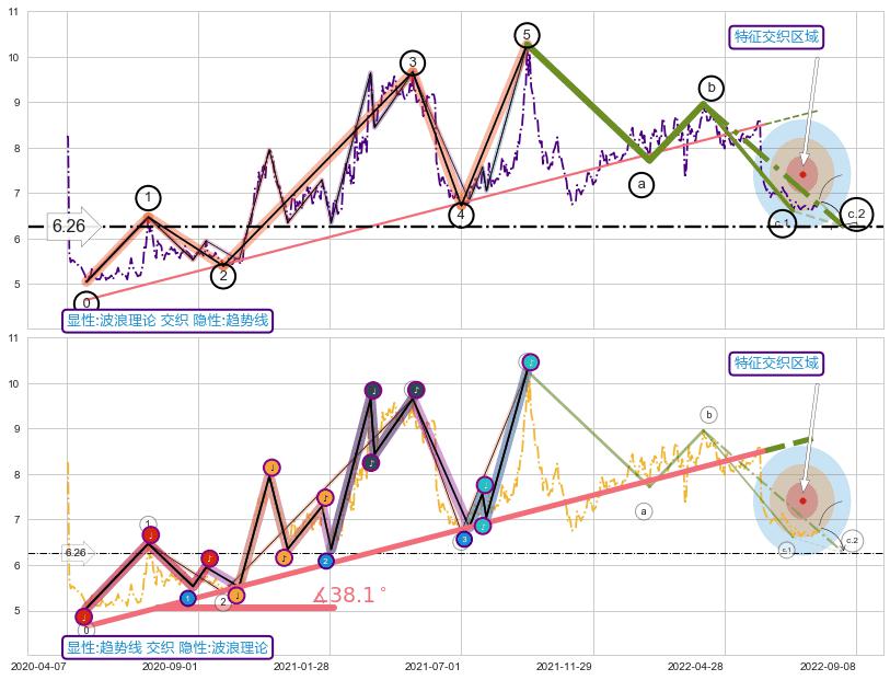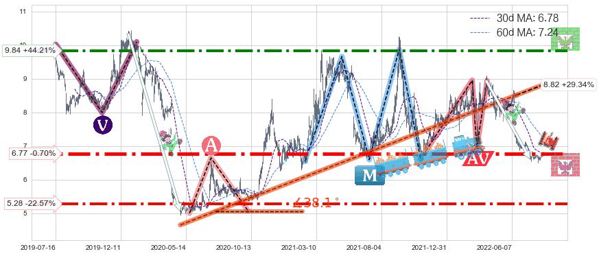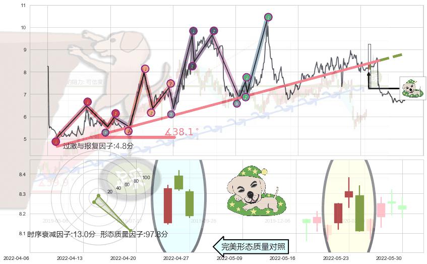 ➣ 2020-04-28-2022-06-16上升趋势存在反转[风险],其原上升趋势的支撑位(8.82)已破位[强阻力信号],原上升趋势角度: 38.1˚