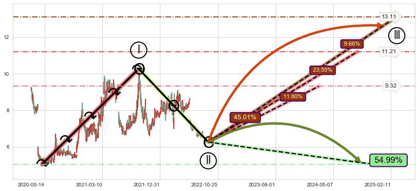 ➣ AI预测: 假定反转启动后, 第❶目标位置(2023-06-01, 7.56)