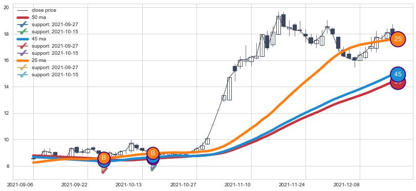 📝 多条均线形成死叉后走势最低价格达到: 22.14