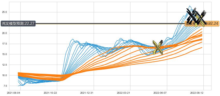 ➣ 34小时均线于(2022-08-09: 23.82)形成【死叉】基于【死叉历史模型】预测死叉后最低波谷价格: 22.28, 死叉后最低价格23.15,尚未达到预测最低波谷价格, 预期继续下跌