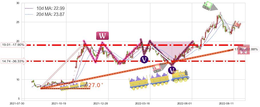 ♘ 支撑价格位14.74,可信任强度76.58%,距离最后交易2022-08-12形成的收盘价格23.15相差 -36.33%